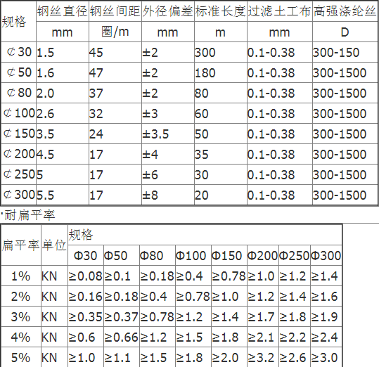 透水管是以防銹彈簧圈支撐管體,形成高抗壓軟式結(jié)構(gòu),無(wú)紡布內(nèi)襯過(guò)濾,使泥砂雜質(zhì)不能進(jìn)入管內(nèi),從而達(dá)到凈滲水的功能。滌綸絲外繞祉覆層具有優(yōu)良吸水性,能迅速收集土體中多余水份。橡膠筋使管壁被覆層與彈簧鋼圈管體成為有機(jī)一體,具有很好的全方位透水功能,滲透水順利滲入管內(nèi),而泥砂雜質(zhì)被阻擋在管外,從而達(dá)到透水、過(guò)濾、排水之目的。